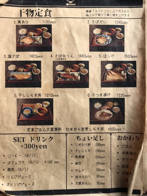 ホッケの干物定食にしらす干しご飯、トッピングに納豆を注文した。大学芋も捨てがたいなぁ...。