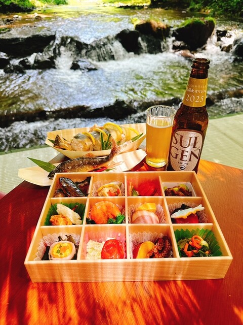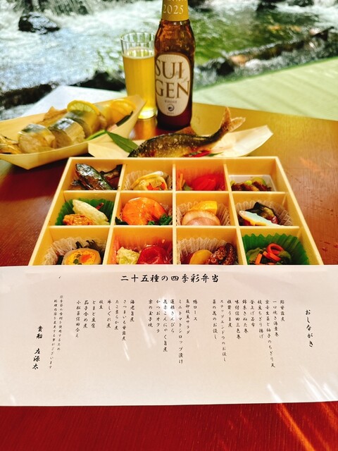 25種の色彩弁当や鮎の塩焼きをつまみながら