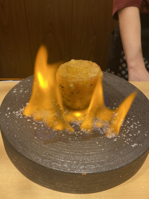 そして 安納芋の天ぷらに 火をつける演出に驚き!