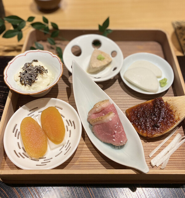 ・八寸 湯葉豆腐 あん肝の旨煮 蒲鉾 唐墨大根