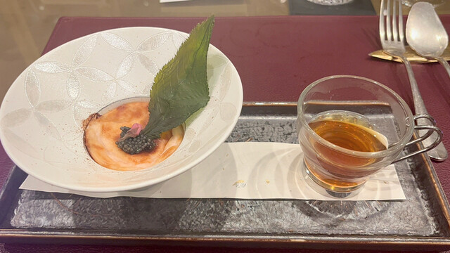 春の焼きフラン 渥美半島春キャベツのソテー ブルーオマール フラン生地は天然鯛のすり身に桜の花の塩漬けを塩抜きして をつぶして入れてるので 桜の香りがします 大和桜にトレハロースを塗って10日間天日干し ブルーオマールのコンソメスープを後半入れて味変