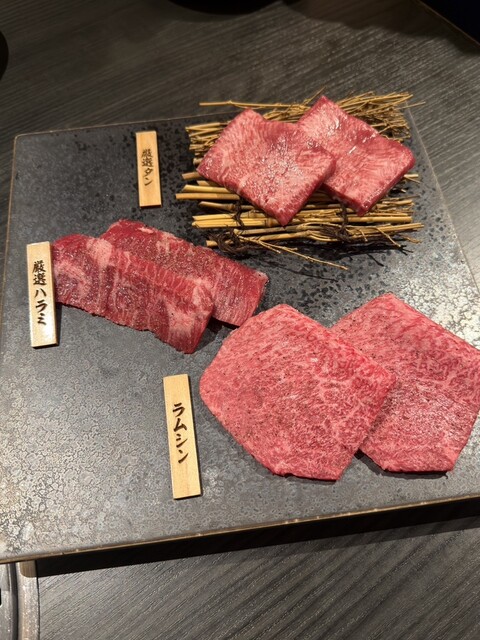 まず登場する「厳選和牛のユッケ」の濃厚さに心を掴まれ、続くタンやハラミ、希少部位のラムシンのクオリティに感動。