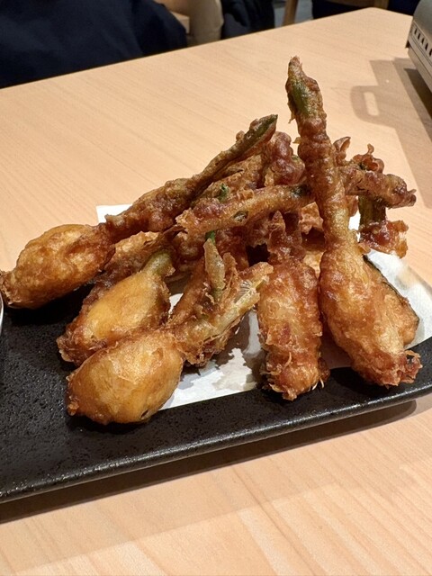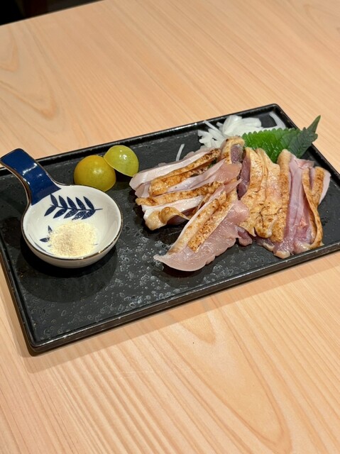 鳥刺しや天ぷらに合わせる塩もにんにくパウダー入りで絶品。