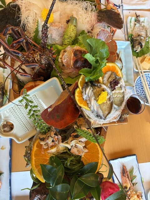 豪華な船盛りは、とても新鮮でまだどの魚も今まで生きていたのがわかるように、ぴくぴくと動いています。活魚は、真鯛、石鯛、ヒラメから選べ、私たちは石鯛が本日は天然物とのことで、石鯛を選択させていただきました。石鯛はポン酢でいただき、とにかく新鮮で歯ごたえがありました。伊勢海老の活き造りも、甘くとても大ぶりで繊細なお味でした。船盛には、そのほかアワビ、サザエの造り、ウニ、鯵のたたきがあり、食べきれないほどの量です。