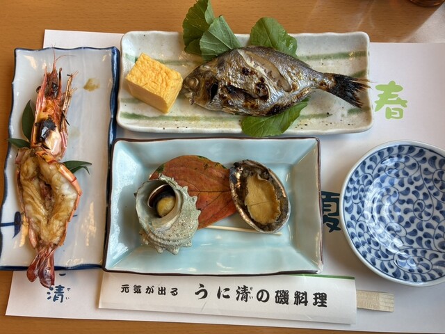 魚塩焼き、サザエつぼ焼きとアワビ蒸し焼き、焼き海老、海老味噌汁、ご飯、漬物