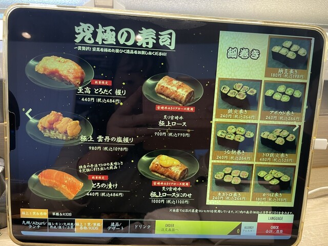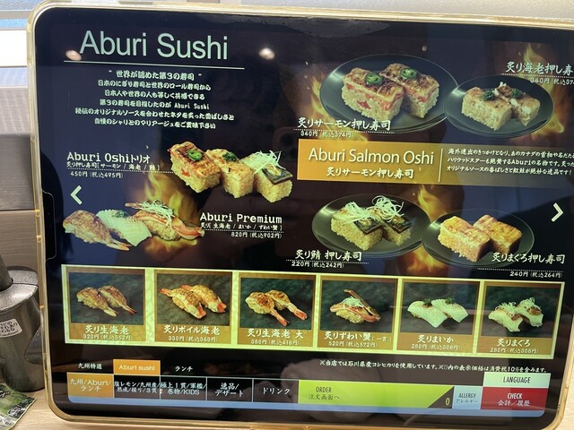回転レーンはあるもののお寿司は回ってはおらず、タッチパネルからお寿司をオーダーするとレーンを通って握りたて?のお寿司が運ばれてきます。店員さんもこまめに空いたお皿を下げに来てくれるなどサービスも悪くない。
