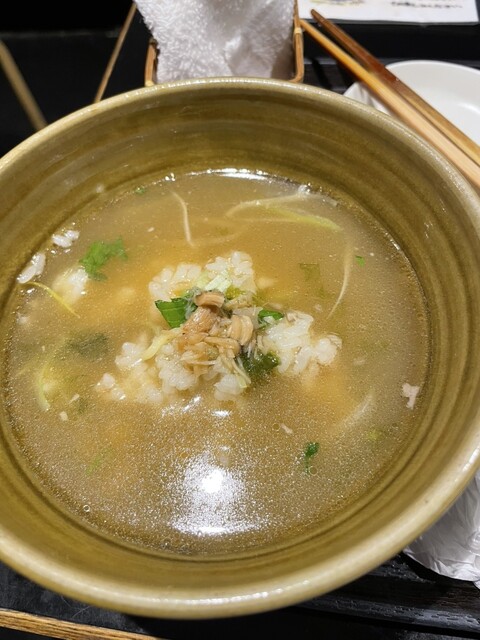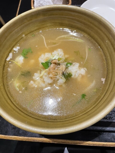 そのままでも十分、鯛のおだしやうまみを感じられるご飯ですが、、スープを入れていただくと一層味が締まりうまみも増すように感じました。