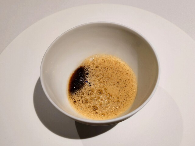 淡路島の鱧、焼き茄子、生ハム出汁の米スープ