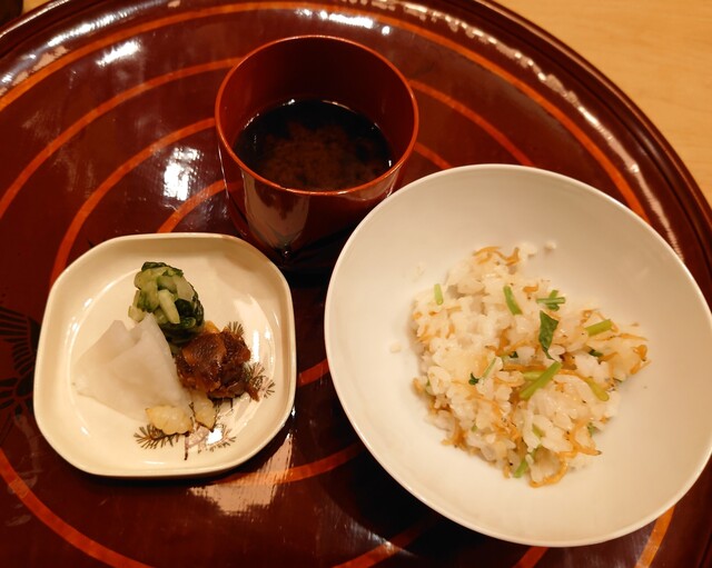 御飯物(せりとちりめん)、香の物、止め椀(味噌汁)