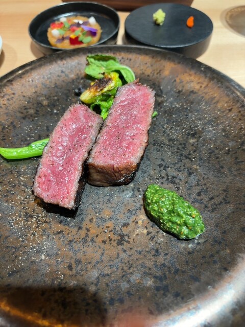 それぞれのお皿もこだわっていて美味しいです。泡やらガスやらも無く、奇抜な味もなく、食べやすいです。メインは、オマールのフライや和牛ステーキ、ほろほろ鳥を食べましたが、焼きが工夫されててステーキと鳥が特に美味しかったです。