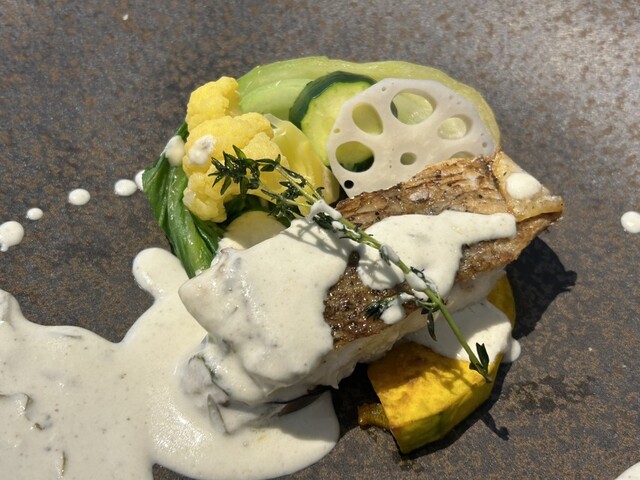 真鯛のソテーは絶妙な火入れで、ふわふわの身がクリームソースと合ってました。