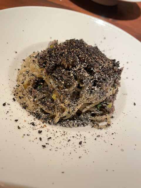井さんのあか牛センマイの黒ごまペペロンチーノ