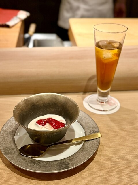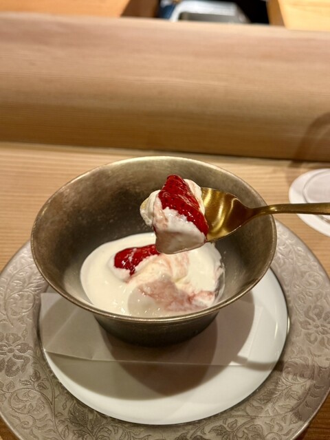 赤ワイン漬けの苺がアクセントになった優しい甘さ。滑らかで、最後の余韻まで心地よかったです。