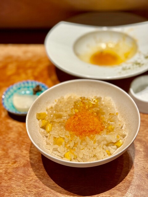 鶏スープで炊いたご飯にとうもろこしが入っています。家でも良く作るとうもろこしご飯ですが、鶏スープで炊いた土鍋ご飯はひと味違う美味しさでした。