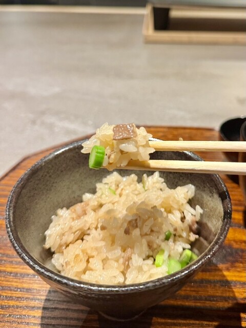 南部鉄器で炊かれたご飯はふっくら。脂と出汁が絡み、香りもたまりません。肉の旨みとアスパラのアクセントが良くおかわり必須です。