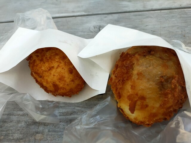 休みの日のルーティン 休みの度にカレーパンと塩パン♪店に着いて か、カレーパンがにゃい(泣)15分位かかるとの事 来週の火曜が窯の点検で休みなので、今日は絶対食べとかなきゃ!と 塩パン取ってレジでカレーパンも一緒に取ってと先にお会計済まして外で塩パン食べながら待ちます 20分位して取りに行くと揚げたて熱々のカレーパンとご対面( ̄ー ̄)ニヤリ久しぶりに揚げたて食うたバイ♪やっぱり揚げたて熱々のカレーパンは美味かねぇ~( ̄ー ̄)ニヤリ 外はカリッと中はルーまで熱々で 口の中が大火傷するバイ(>ω<)