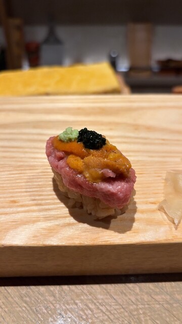 特に印象的だったのは、トロ・雲丹・キャビアが重なり合った贅沢な一貫。口に運んだ瞬間、濃厚な旨味と磯の香りが渾然一体となり、赤酢のシャリがそれらを鮮やかに纏め上げます。まさに至福の口溶けでした。