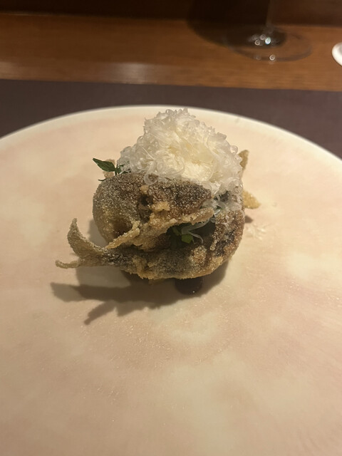 鮎と鮎がお皿の上で舞っているかのように支え合い、いただく時に交差しているフリットを取り分けるのもワクワクしました。見た目の美味しさとワクワク感✨