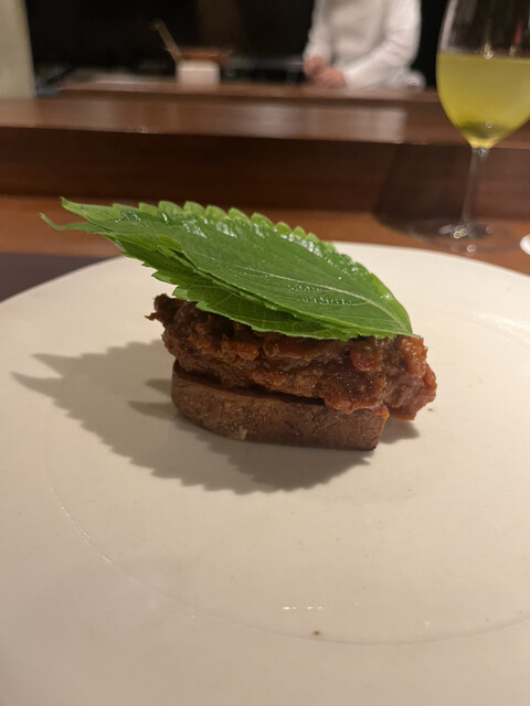 ☆ソグラサーダ、馬肉のパテ、燻製卵黄、パン粉、タルタル仕上げ、エゴマの葉、大葉