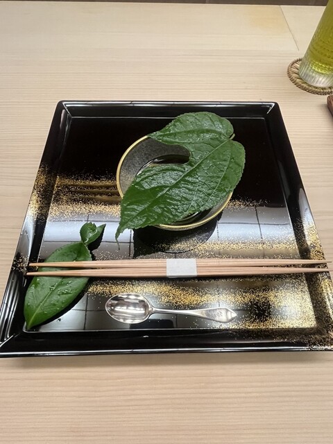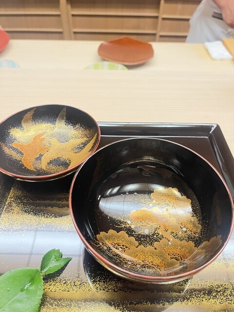 お料理は美しい五色寄せで視覚も口の中も涼やかなはじまりに。金魚葉椿のお箸置きが素敵でした