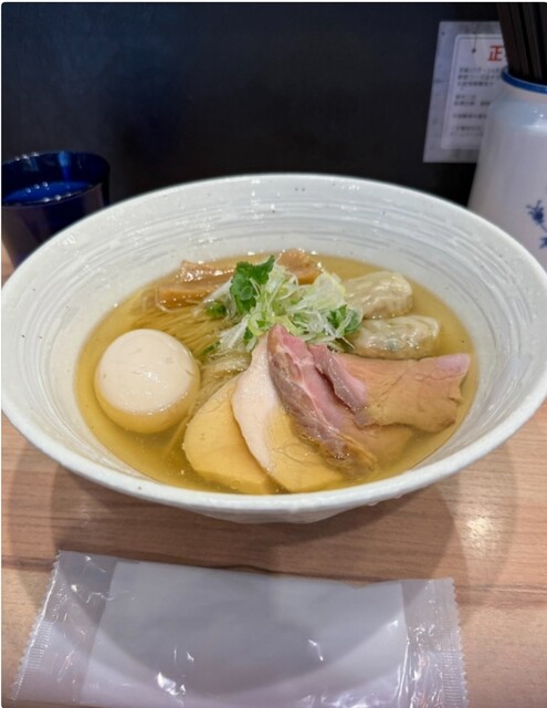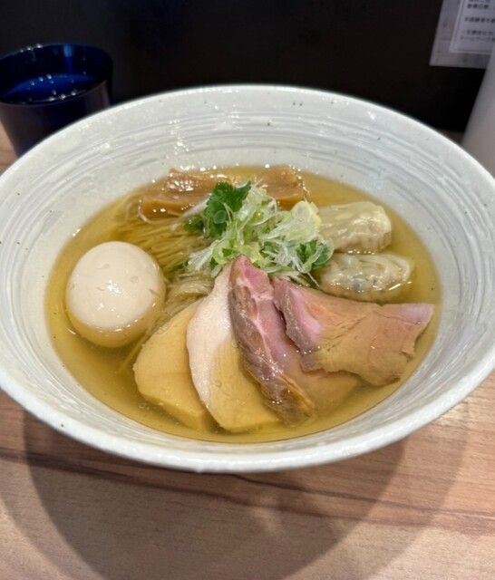 トッピングは低温調理されたチャーシュー2種4枚(鶏、豚)、雲呑2つ、味玉、メンマ、ネギです。