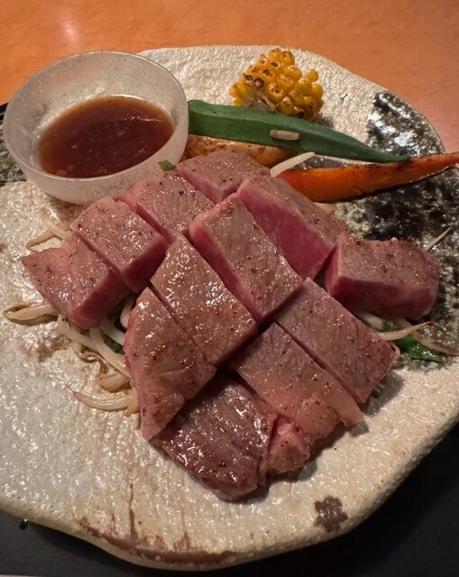 鉄板焼は、仙台産の黒毛和牛サーロインステーキをレアで。ブルーレアやブルーで注文する人もいるとか。