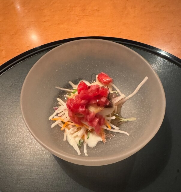 先附は、山形の出汁ソースを使ったアワビのカルパッチョ。