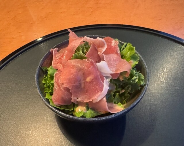 オードブルは、イタリア パルマ産の生ハムの胡麻ドレッシングのサラダ。
