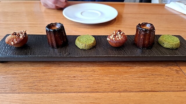 (手前)豚さんのサブレに挟んだ豚肉のリエット。(右上)竹炭とチーズを練り込んだシュー(左上)竹炭を練り込んだお米のチップスにドライトマトとオリーブ、炒めた玉葱のペースト、そして鰯のマリネを合わせて…✨