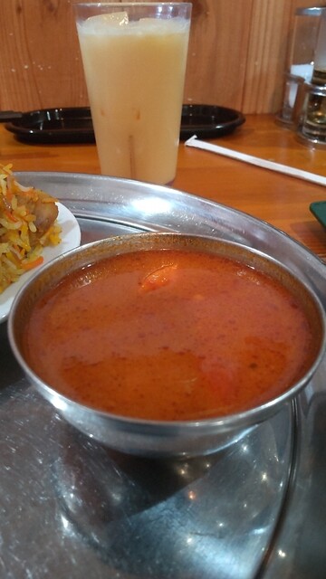 ランチでビリヤニ\1000→¥950だったので、これを注文、サラダ、ドリンク、1種類のカレーが付くそう。ドリンクはマンゴーラッシーを注文。初ビリヤニだったので、ご飯がめっちゃ多いなって思っていたら、中からタンドリーチキンがゴロっと登場!ビリヤニはカレー風味のパラパラライスで、これだけでもスパイシーでおいしいですが、こちらもゴロっとチキンいりのトマト風味のカレーを付けて食べるとより美味しい♪ちなみに、ナンと白ご飯のおかわりは無料ですが、鶏肉多目とカレーがスープっぽい感じだったので、今回は見送り。ビリヤニは毎日有るわけでは無いらしいので、次回もあったらリピしたいです。
