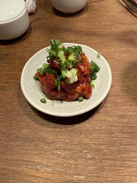 タン塩はいつも通りジューシーで柔らかく、レモンとの相性抜群。炭火で焼くとどうしてこんなに美味しくなるのでしょう。盛り合わせはどの部位もクセがたくて食べやすかったです。こちらのタレ、ホルモン少し酸味があるので脂っこいホルモンでも、あまりしつこさがなく感じるので、ついつい沢山たべてしまいますね。ハラミやツラミもジューシーで、噛むほどに肉汁が溢れてきます。卓上に辛味をプラスできる醬があるので、それをタレに入れて食べても美味しいですよ。箸休めでネギサラダで口の中をリフレッシュするとまた、肉が食べたくなります。チョリソーも炭火焼きで焼くと炭の香りがプラスされ、辛味もあってビールついつい進みます。チャンジャも甘すぎない味付けて美味しかったです。今回も外れなしのホルモンでした。因みタレもオススメですが、塩の味つけホルモンもレモン汁とコンビネーションが抜群ですので、どちらも食べてみていただきたいです。ごちそうさまでした。