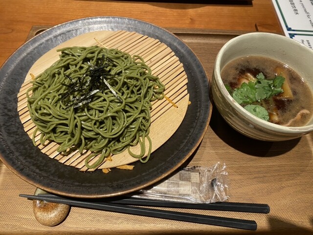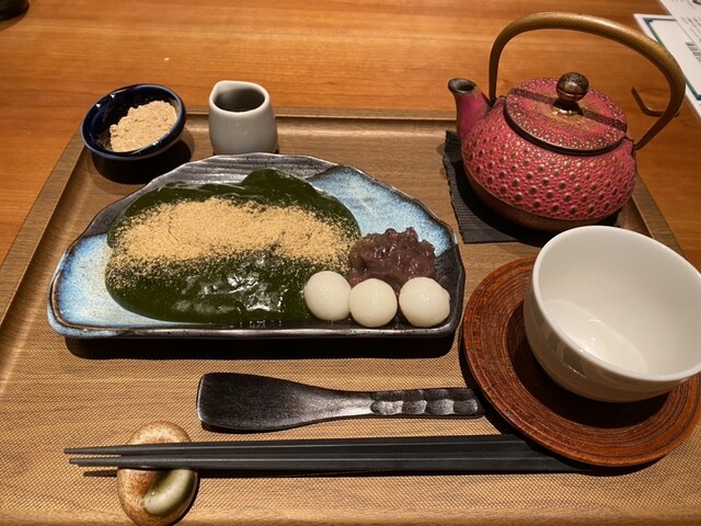 温かい出来たてのわらび餅、茶そば(鴨汁つけめん)を注文。