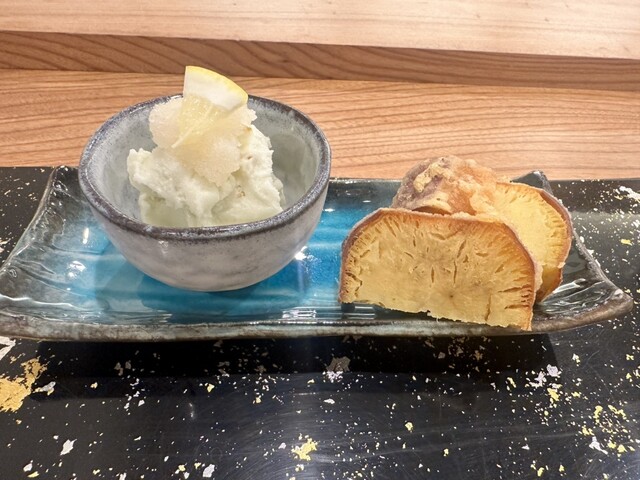 デザートも丁寧!!さつまいもの天ぷらにシャインマスカットのアイス。