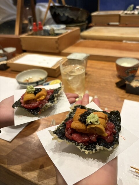 中でも「海苔天に鮪と雲丹とキャビア載せ」は、