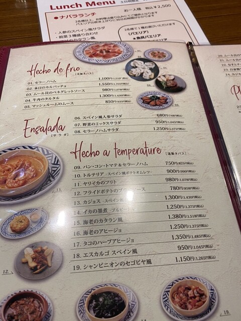 休日ランチは2名以上なので、アラカルトからスペインサラダ748円と魚貝のミックスパエリア(ハーフ)1,650円を注文しました。