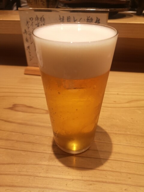 土曜日の夜、ライブが終わってから午後9時過ぎに到着。カウンターのみの店内はほぼ満席。比較的若い客層が多くまだまだ宴は続くという雰囲気の中生ビールから我々の宴も始まった。