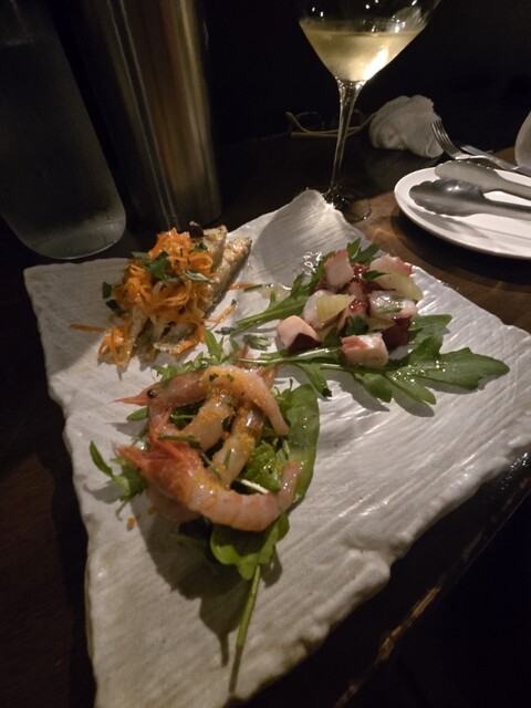 最初に、魚介前菜の3種盛り合わせとからすみ入りの菜の花マリネを注文し、イタリアワインをチビリチビりと飲み進めた。そうこうしているうちに開店から30分も経たないうちに、カウンター席はカップルによってすべて埋まった。