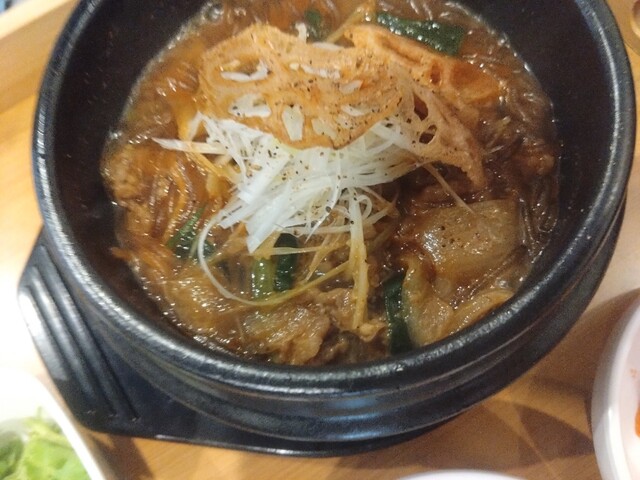 プルコギ 熱々の器に春雨と柔らかくて ジューシーな牛肉が入っています 甘めの味付けでほとんど辛くなくてとても食べやすいです