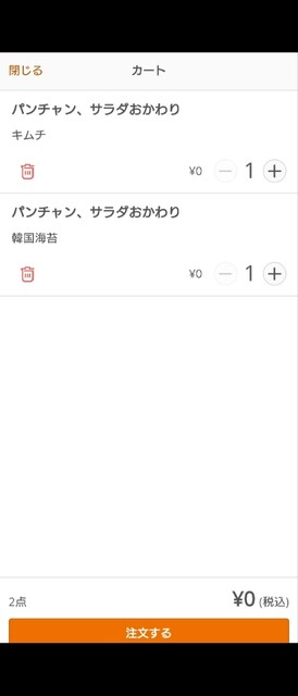 キムチと ナムル(ナムルがついているメニュー)と 韓国のり(韓国のりがついているメニュー)おかわり 0円です