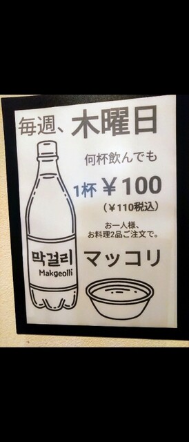 木曜日はマッコリ 110円のポスターを発見。