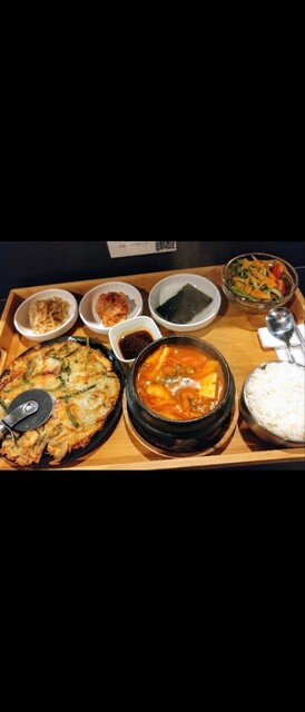 ご飯が入っていて栄養満点の熱々スープです。グツグツ でくるのがたまりません♡スープはしっかり濃い味で好きな味です。チヂミは、酸味のあるキムチの入った美肌になれそうな チヂミ。チヂミにキムチが入ることでキムチの 酸味がまろやかになって、甘いチヂミの生地 ととてもよく合います。発酵食品が大好きなので嬉しいです。キムチって 水気があるのにチヂミがパリパリに焼けていて、中はもちもち。美味しくいただきました。