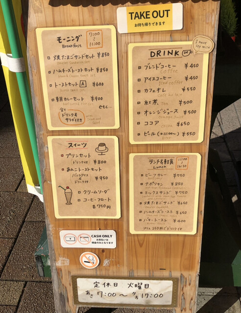 7:00-11:00の時間帯でモーニングがオーダー可能です。内容は焼きたまごサンドやあんこトースト、さらにカレーセットやクリームシチューセットなども頼めるようでした。後者2つは前回見かけなかったので、少し興味をそそられました。