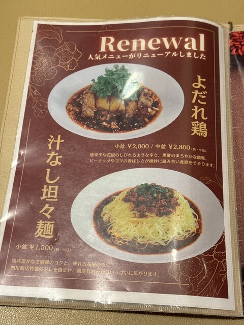 よだれ鶏、汁なし担々麺メニュー