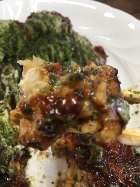 お好み焼きがふんわり大きいので食べごたえ有り有り、、友達の二人は、うどん焼き、豚卵モダンを注文していました。私は、豚卵焼き、でも、半分でもお腹が一杯になって、結構しんどかったですね。地元のおじちゃん、おばちゃん二人で商ってる見たです。気さくなので、安心して訪ねてみて下さい。美味しいかったです。ご馳走様でした。