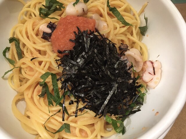 ライブが終わっての遅い時間にもかかわらず、お店はお客様でいっぱい、大人気ですね。メニュー、豊富、どれも美味しいそうで迷ってしまう…でも、私は明太子は好きなので、明太子とヤリイカのパスタに彼は、パンチェッタと帆立の焦し醤油バターソースに決めました。やっぱり、明太子のパスタは美味しいですね。間違いない‼️美味しいく頂きました。ご馳走様でした