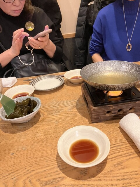 お通しがわかめのしゃぶしゃぶこれがコリコリしてて出汁にさっと浸すと色がかわって楽しくて美味しい。蕎麦道サラダそばの揚げたのが載っててアクセントになる、串焼きの鶏はまあまあ、さつま揚げふわっとしてて美味しく、〆のざる蕎麦は2人前から選べ今回は4人で4人前それぞれ好きなつけ汁を選んで食べた皆美味しいと言ってました。日本酒は辛口中心と言ってて種類も多い。