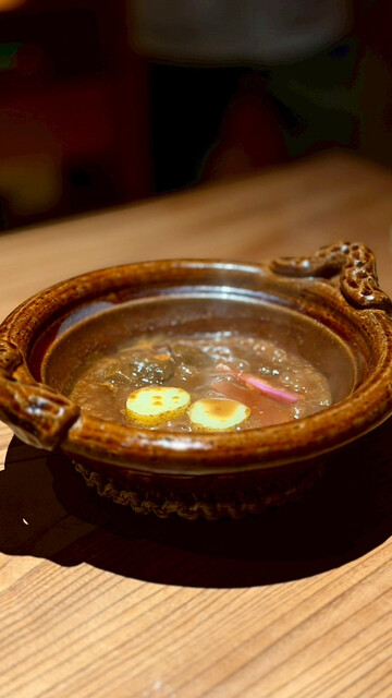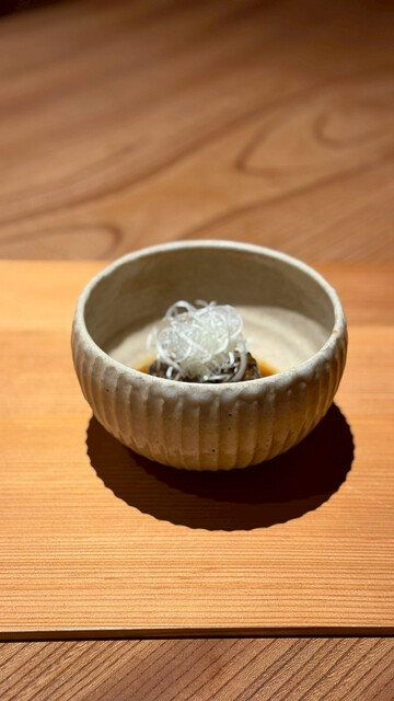 中盤の白眉は、コガモ半身焼きと仔熊(月齢6ヶ月)のスペアリブ。コガモはレバーや砂肝、内臓脂肪まで添えられ、野鳥の旨みが立体的に迫ってくる一皿。仔熊のスペアリブは、親熊とは異なる柔らかさと、骨周りにびっしりとまとった脂が印象的。重さは皆無で、むしろ澄んだ甘みが残るのが不思議。家畜の脂とは別次元の軽やかさで、ジビエの魅力は脂にこそ宿る、という言葉が腑に落ちます✨