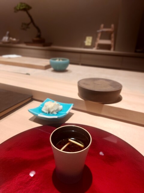 予約の19:30に入店。店内は、最近よくあるインバウンド向けの「派手さ」や「煌びやかさ」優先の内装ではなく、モダンながら純日本風の明るく清潔感のある日本人が落ち着く空間。さすがに緊張感で身も引き締まってましたが、職人さんの笑顔と物腰柔らかなお出迎えで和らぐ。カウンター席はL字の白木で、座ると奥行・幅ともゆったりとして贅沢なスペースが確保されてる。