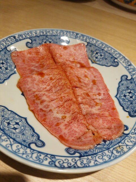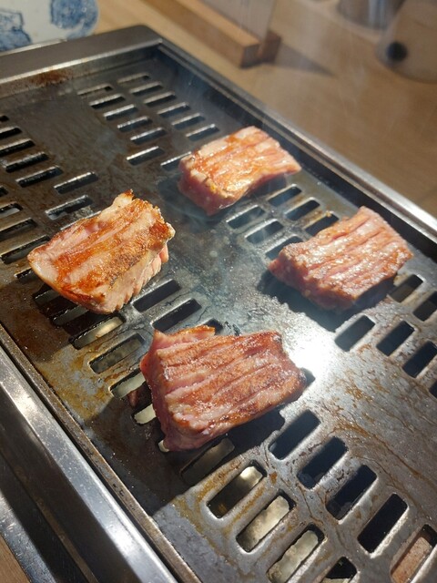 京橋駅から徒歩すぐ、ロッソ京橋ビルの2階にある「焼肉・ホルモン 踊ル」さんにて会食。なかなか予約が取れないとの噂を聞いていましたが、定例で食事会をする飲み友が「予約が取れた!」とのことでお伺いすることができました。外観はシンプルながら、一歩入ればスタイリッシュで落ち着いた雰囲気の焼肉店。カウンター席・テーブル席ともに店主さんが全体を見渡せる配置。お客さんが会話に夢中で肉の食べ頃を見逃さないよう「そろそろ食べ頃ですよ!」と声を掛けて下さる気配りも心地良く、ライブ感ある肉のカットも含めて五感で楽しめる一軒です。色々とおすすめもお伺いしながらアラカルトにてオーダー。