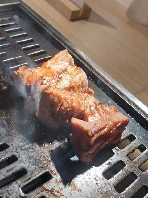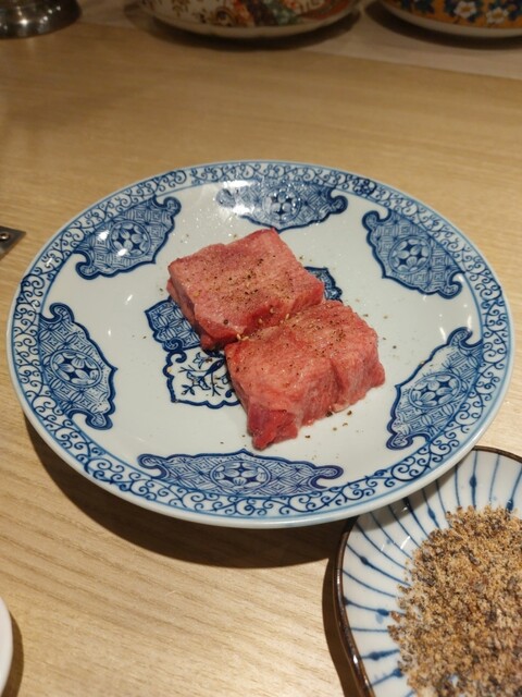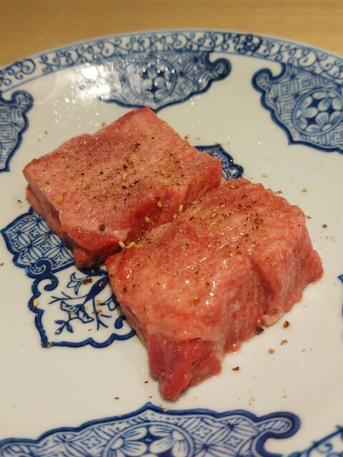 極厚のタン元に美しい隠し包丁。焼き上がりを細かく刻まれた「昆布塩」で。塩気は極限まで抑え、全体にたっぷりとまぶすことでタンの旨味を最大限に引き立てる仕立て。豪快さの中に繊細さが光ります。